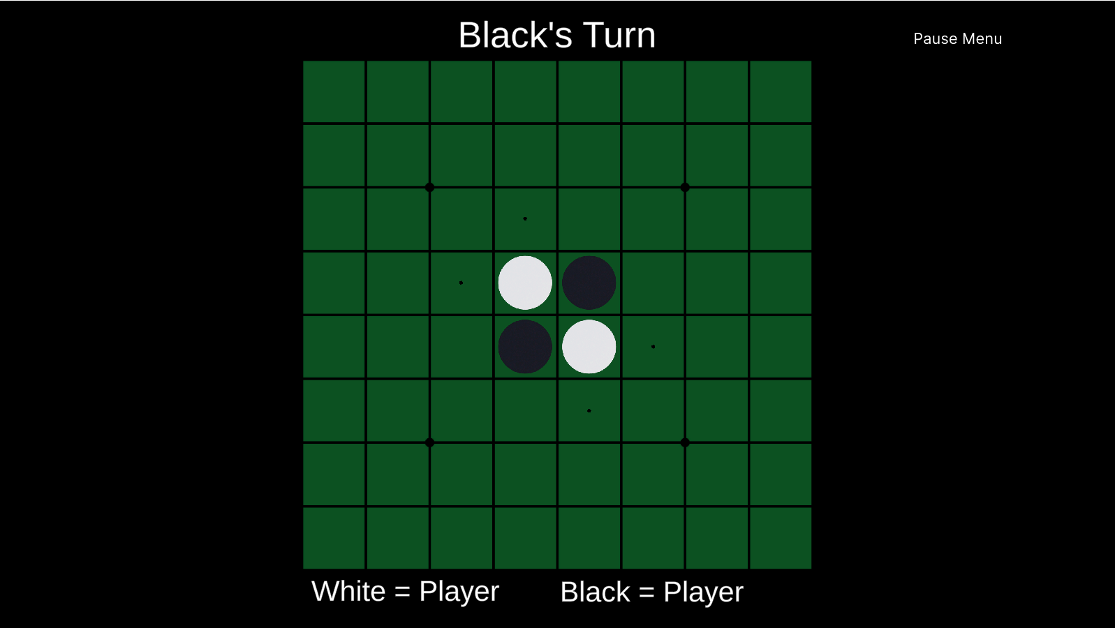 This is a version of the board game Othello I made. The rules of Othello are simple. You play as either the black or white pieces. You capture the opposite color pieces by placing a piece so that it sandwiches your opponents’ pieces. Black always moves first and you cannot pass. If you have no moves your opponent moves again. If neither player can move the game ends. The winner is the player with more pieces.